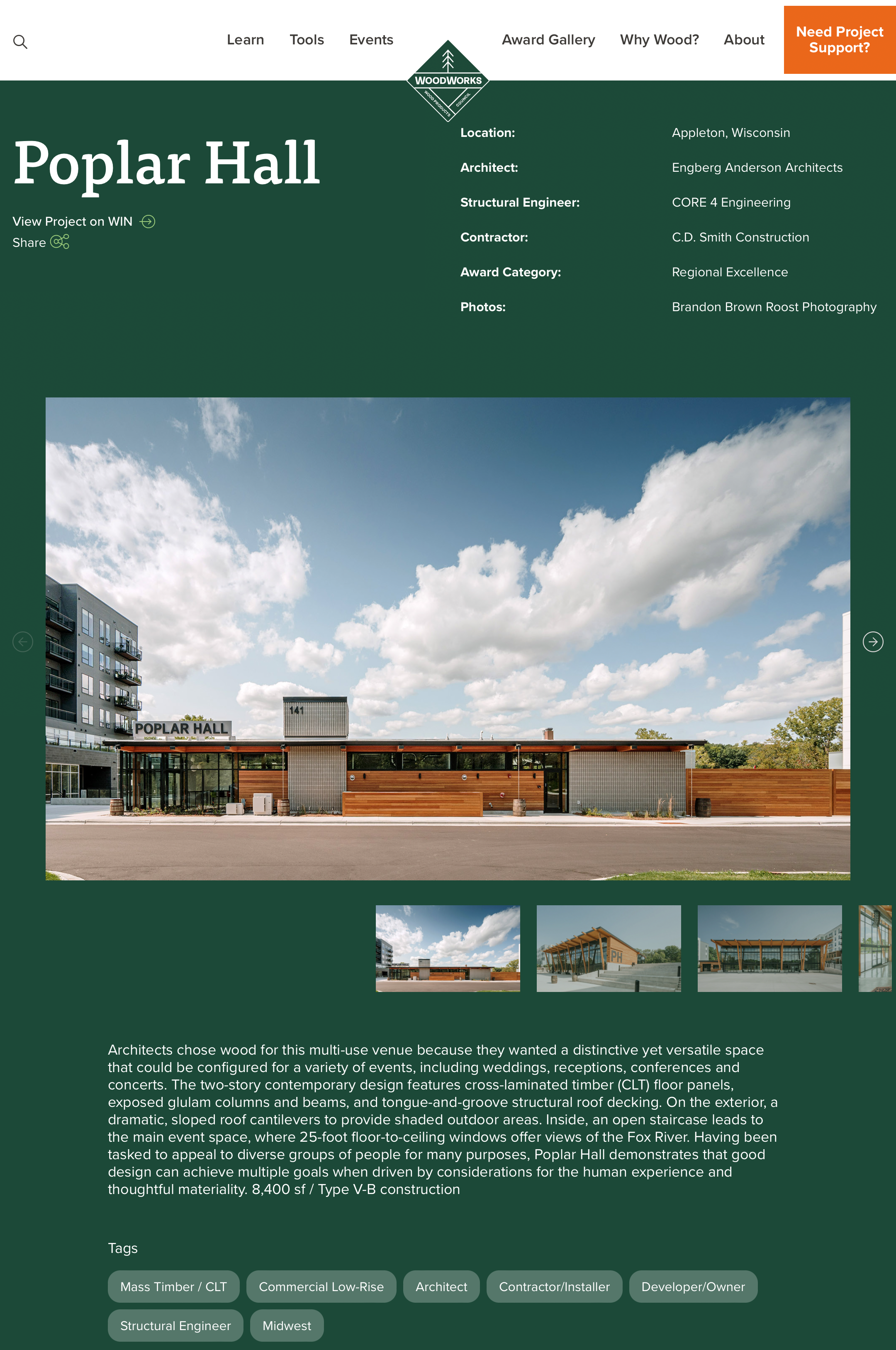 Architects chose wood for this multi-use venue because they wanted a distinctive yet versatile space that could be configured for a variety of events, including weddings, receptions, conferences and concerts. The two-story contemporary design features cross-laminated timber (CLT) floor panels, exposed glulam columns and beams, and tongue-and-groove structural roof decking. On the exterior, a dramatic, sloped roof cantilevers to provide shaded outdoor areas. Inside, an open staircase leads to the main event space, where 25-foot floor-to-ceiling windows offer views of the Fox River. Having been tasked to appeal to diverse groups of people for many purposes, Poplar Hall demonstrates that good design can achieve multiple goals when driven by considerations for the human experience and thoughtful materiality. 8,400 sf / Type V-B construction